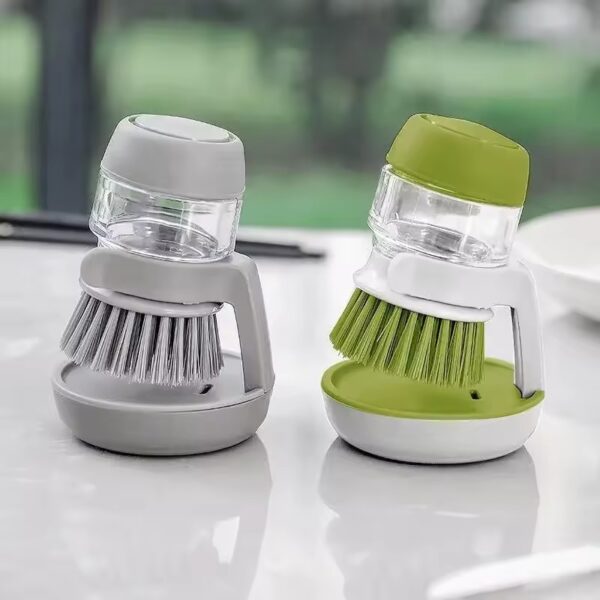 Alles-In-Één Zeepborstel: Vul hem één keer met afwasmiddel en druk op de zachte knop bovenop om de zeep los te laten terwijl je schrobt. Je hoeft niet meer te stoppen om de fles te pakken.